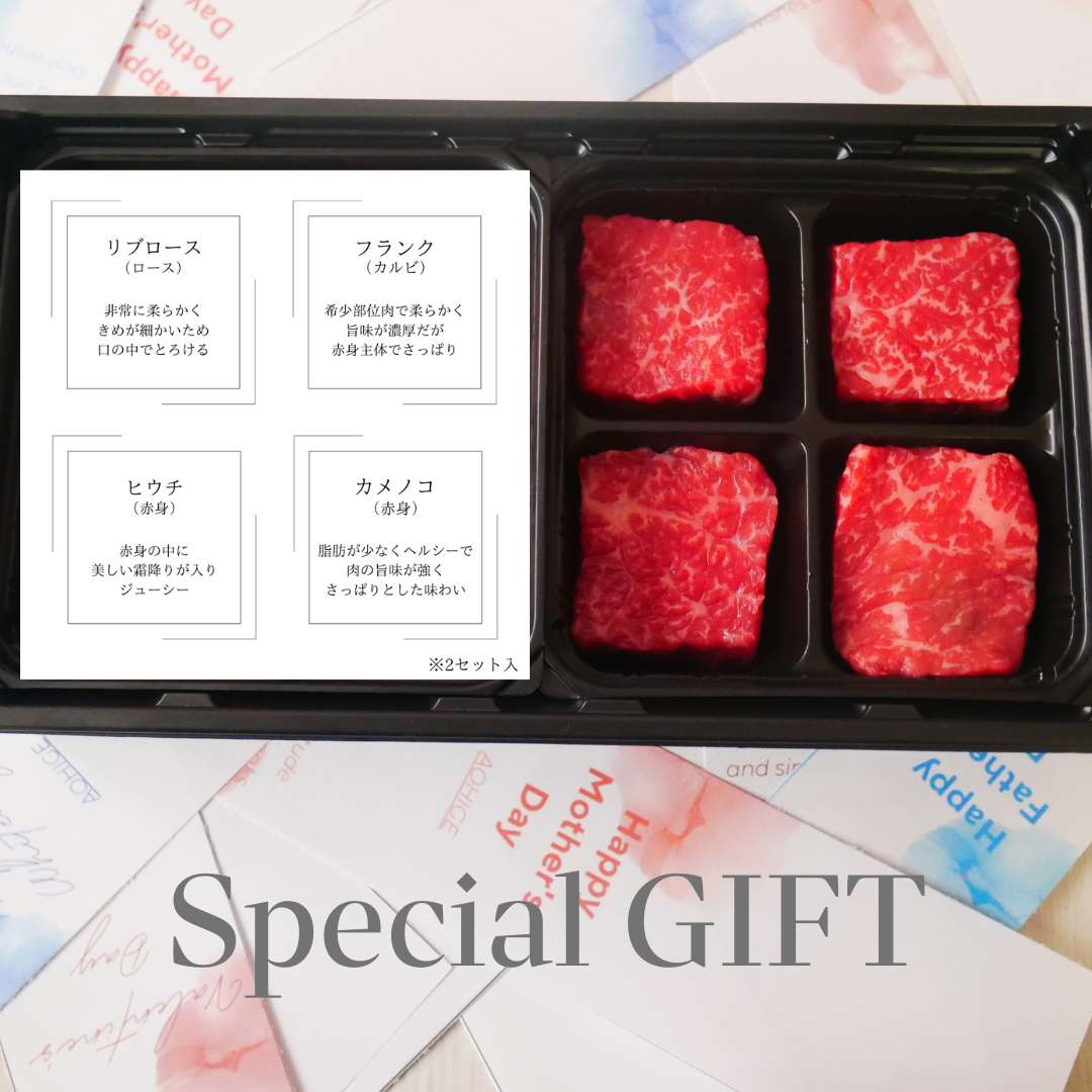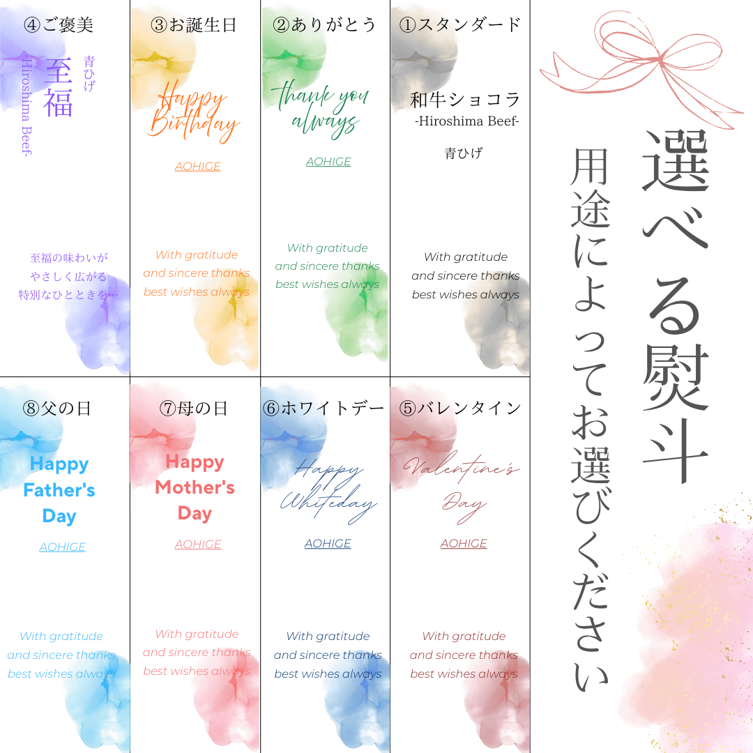まるでチョコレートのような見た目に仕上げた和牛ショコラ。様々な部位をチョコっと楽しんでいただきたい…そんな想いを込めて作りました。ロース、カルビ、赤身2種を詰め合わせたオンラインストアの中でもバランスのよい商品。「青ひげの広島牛を試してみたい」「ちょっとした贈り物をしたい」方へおすすめです♪また、一般的な肉チョコのサイズよりひとまわり大きくカットし満足感も追及したこだわりの逸品です。